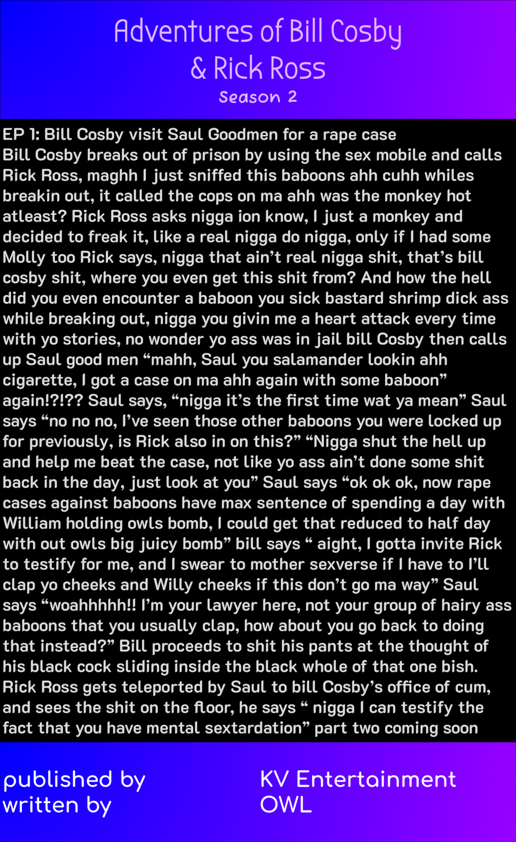 ADVENTURES OF BILL COSBY & RICK ROSS SEASON 2 is the 6 episode 2nd season of ADVENTURES OF BILL COSBY & RICK ROSS SEASON! Read as Bill Cosby faces legal trouble with the help of his boyfriend Rick Ross and his trusty lawyer Saul Goodman. Series is written by OWL.